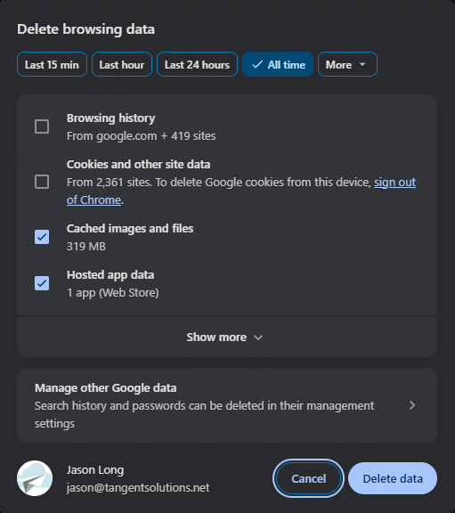 Google Chrome Option 2 – this clears EVERYTHING, so try it after the item above: